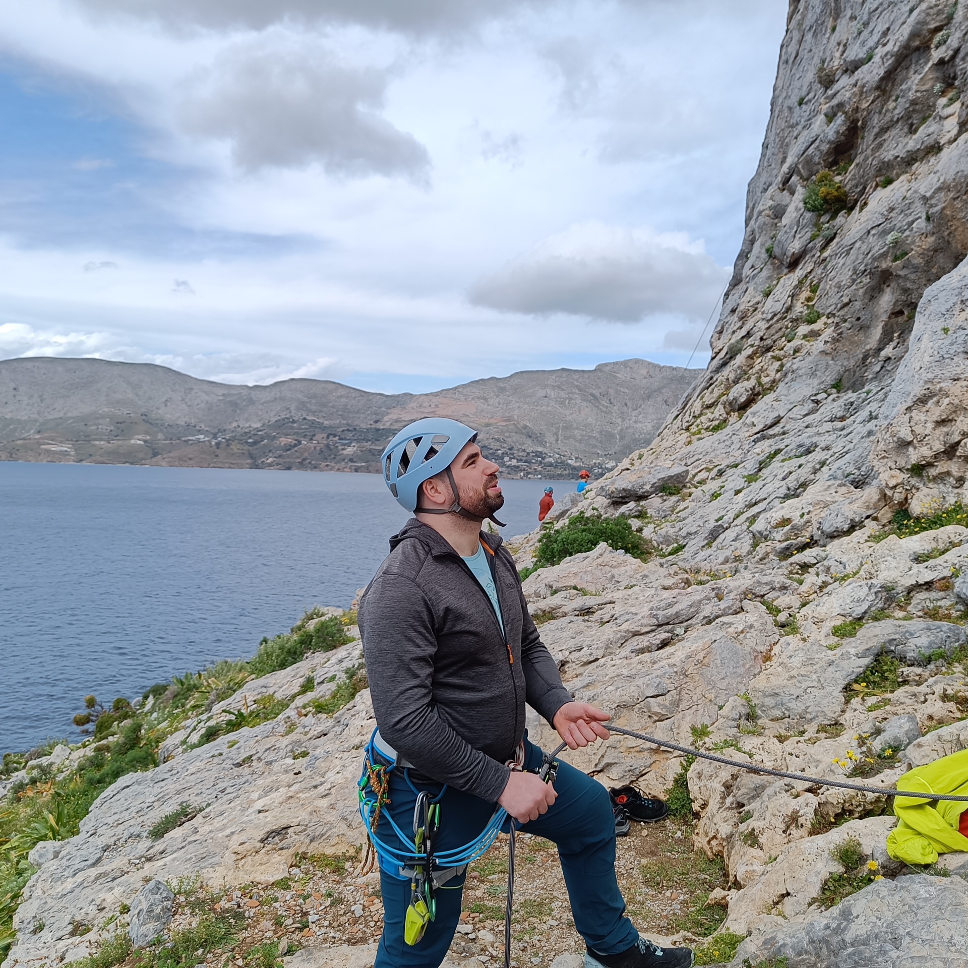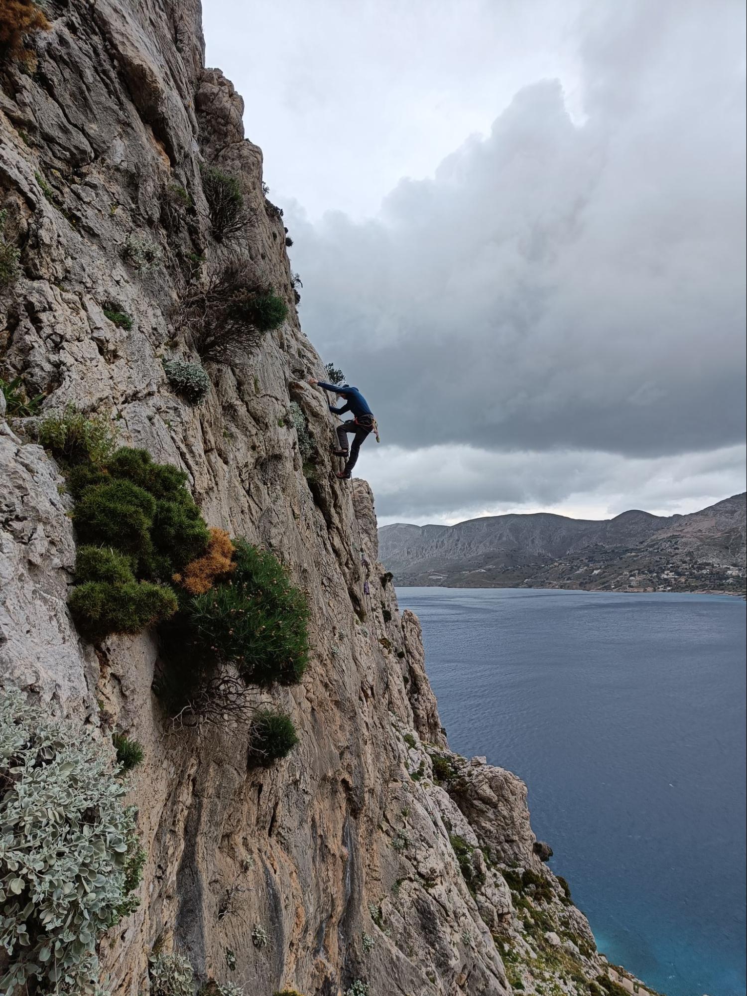 On our first day of climbing (6th April) we visited a sector called Kasteli, which is a tower-like promontory of rock situated on a small peninsula. We got used to the rock working our way through the grades starting with a 3c incrementing our way up to 4c before the heavens opened and we made a hasty retreat to the car, leaving our draws in the route. We popped into town (only 5 mins from the crag) and grabbed some lunch in a local cafe while waiting for the weather to brighten up. Fortunately, the rock in Kalymnos dries very quickly and by the time we had finished lunch, it was looking dry. We went back to Kastelli to retrieve our quickdraws and then decided to move onto another crag a bit further round the coast called Summertime which was north facing and sheltered from the Southwesterly winds that were bringing the rain. We continued to work our way up the grades here doing a further 3 routes finishing on Soupia the Great** a steer but very juggy 5b.