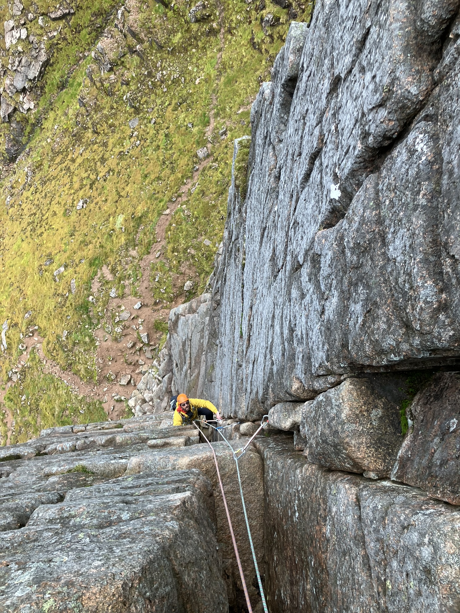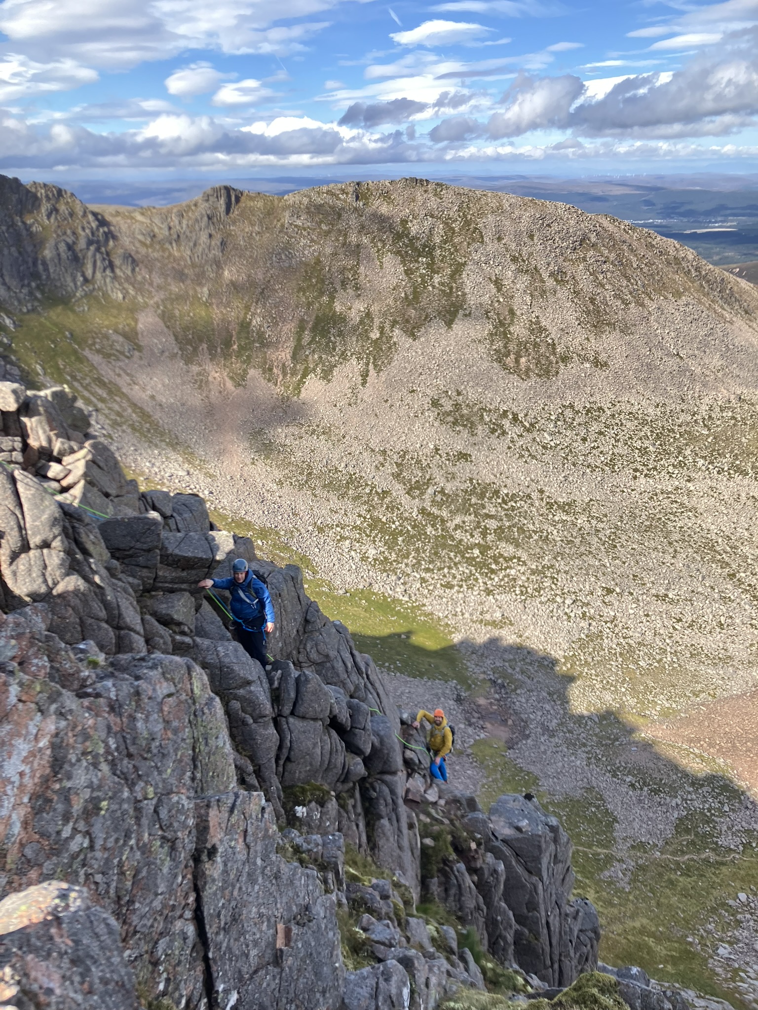 Peter, Ken and Dan headed into Coire an’t Sneachda to climb Pigmy Ridge. Another classic climb where the approach is as exciting as the route requiring the rope. Peter doubled down by bombing Kent and Dan with his rucksack from the belay – luckily it didn’t go too far but it did snap the tops of his walking poles off… Clip your bag to the belay! The climb was great, ably led by Kent on P1 and Peter for the rest while the wind howled. Lots of stuck gear – Peter retrieved a Rock 6 and a DMM 3 for his collection (no tough tags).