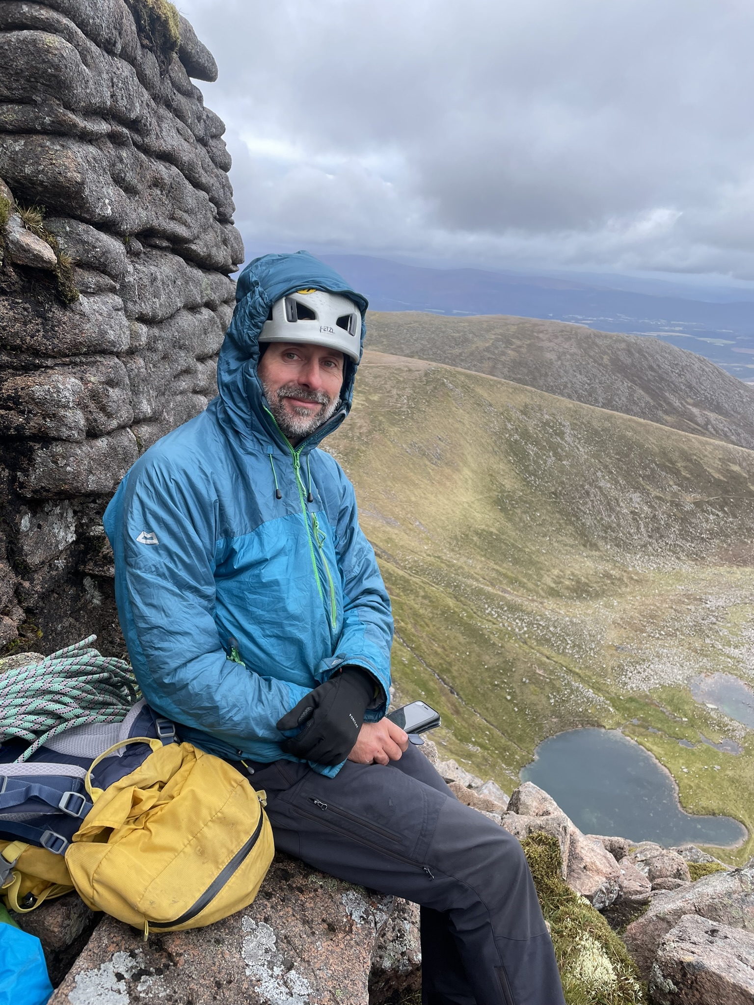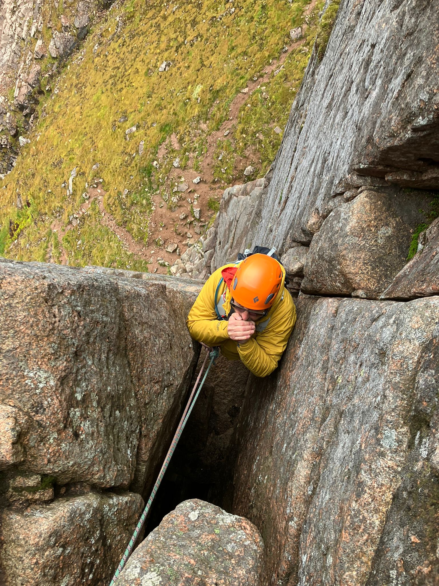 After a long windy walk in Peter and Kent decided that Fallout Corner was too wet and so climbed Savage Slit. Peter tried it in his big boots but had to change to rock shoes half way up the second pitch! It was quite chilly with cold hands all around and the odd spotty rain but at least sheltered from the wind. Proper Scottish mountain climb! During the climb we observed a group throwing a large boulder off the opposite coire rim and filming it – unbelievable! A good climb and a quick walk back down the MacDui path.