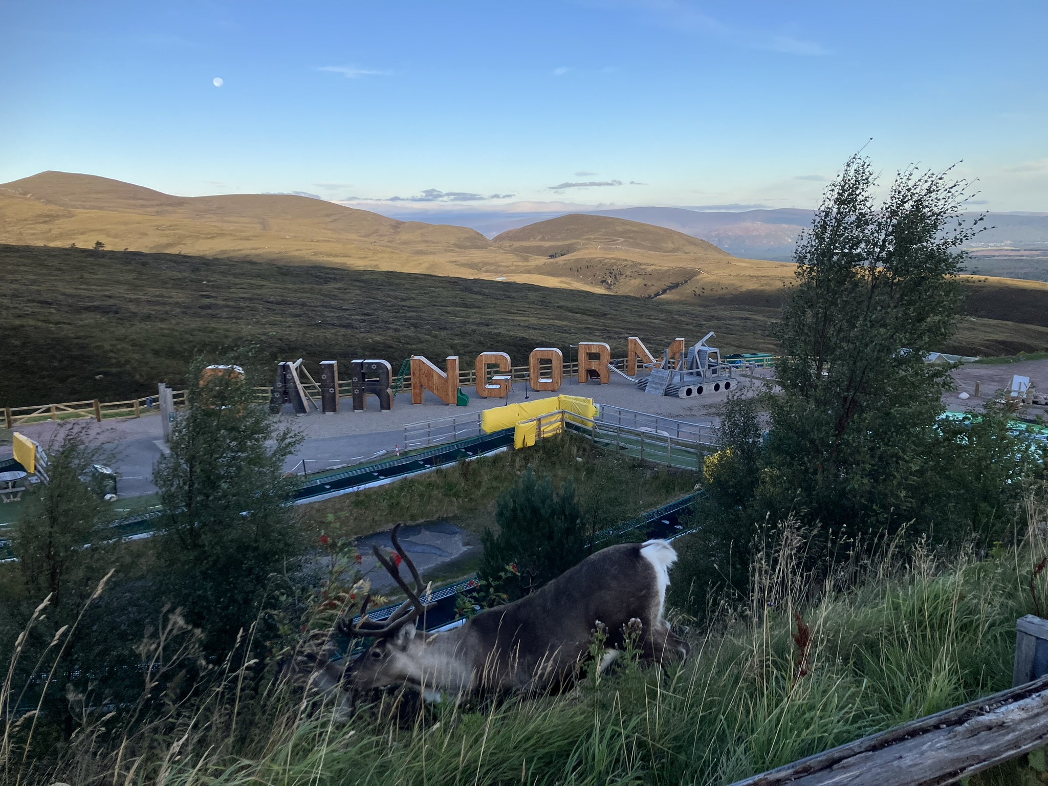 Dave and Andy walked up Ben Macdui in the wind and took great pictures of the climbers. Everyone walked off via Cairngorm and had a coffee at the Mountain Shop in Aviemore while Peter bought new poles….. Rheindeer in the car park at the ski centre. Peter got stung by a wasp and had a large local reaction on his leg which was unexpected.