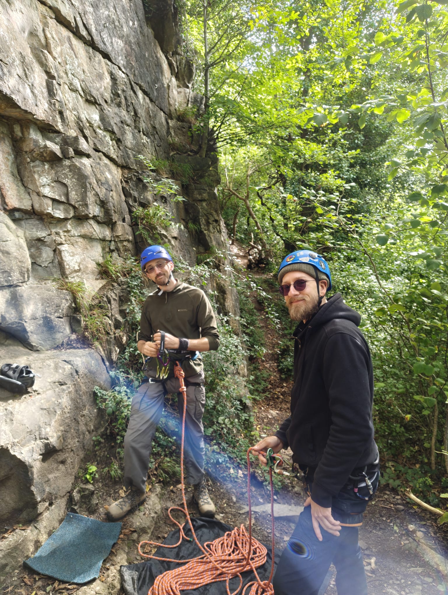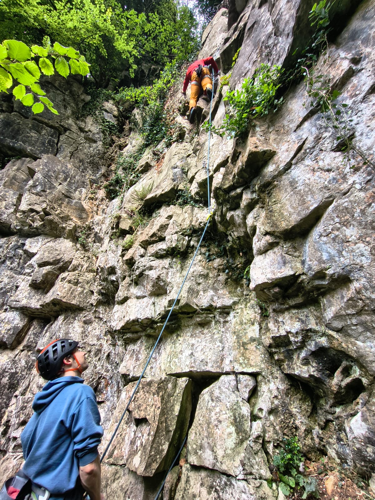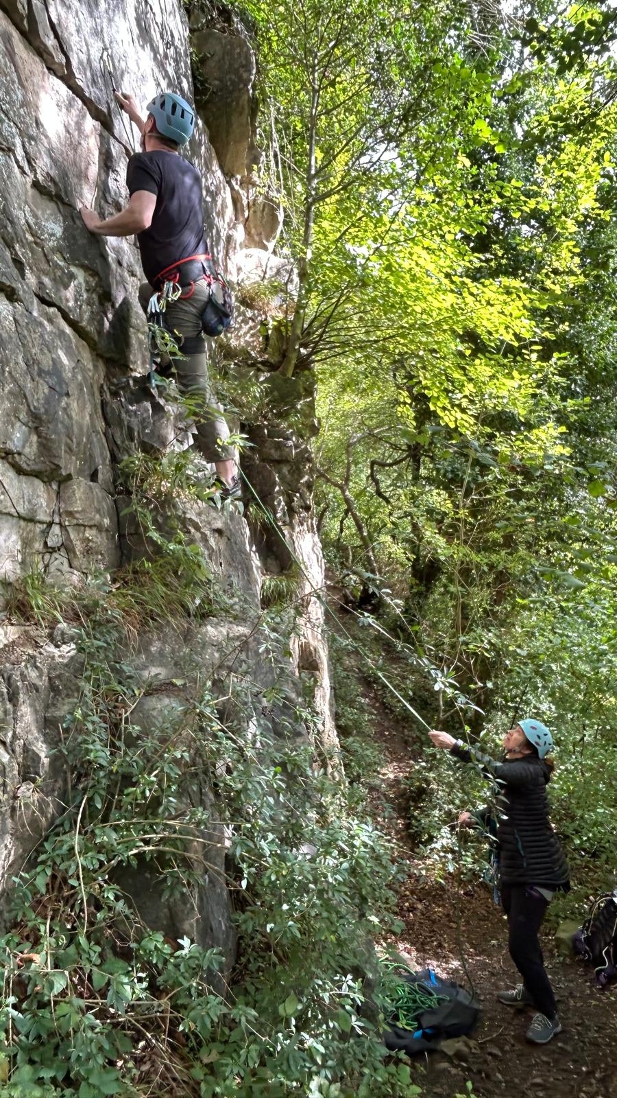 Sunday was unexpectedly sunny and warm, and the whole group went sport climbing at Wynd Cliff Quarry, joined by Brad who came for the day. Loz led and stripped his first ever sport climb. Gill led and stripped her second. Ange had never sport climbed before and said she wasn’t keen to climb outside but with a little gentle persuasion she was successfully getting up all the routes on top rope and had a great time with us. We climbed all day at Upper Lift Right, including Banarama, The Banana Splits, Nice Thicket, Simples and Hooting, to name a few of the climbs. Josh, Dom and Brad did harder stuff.