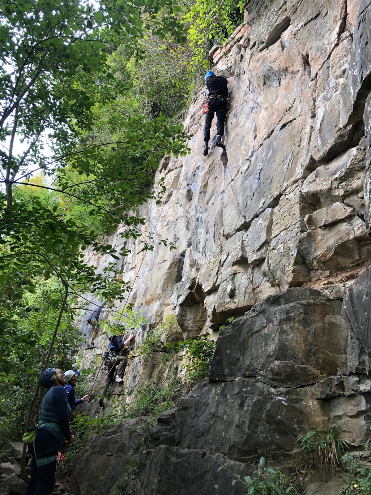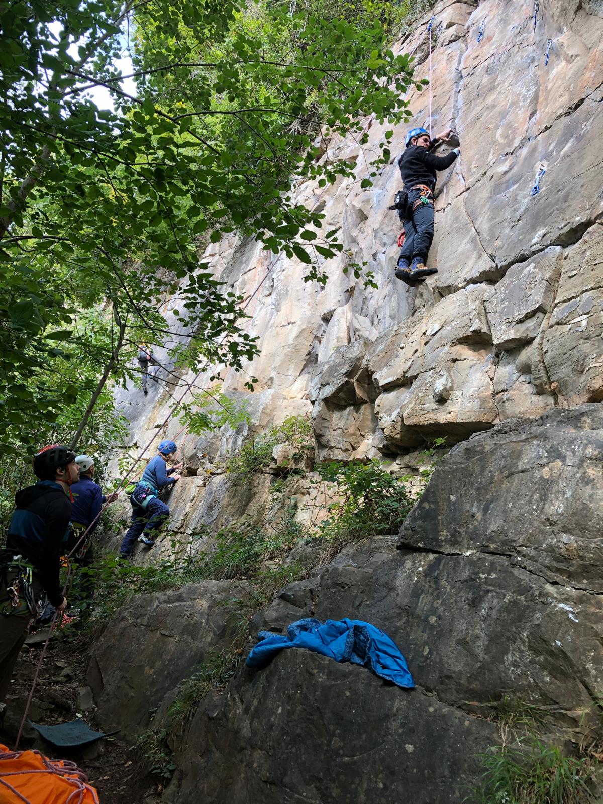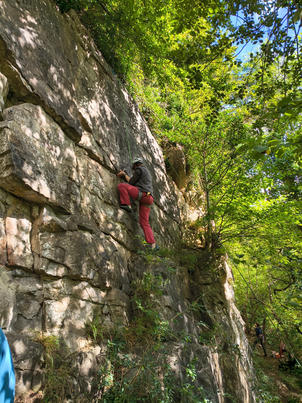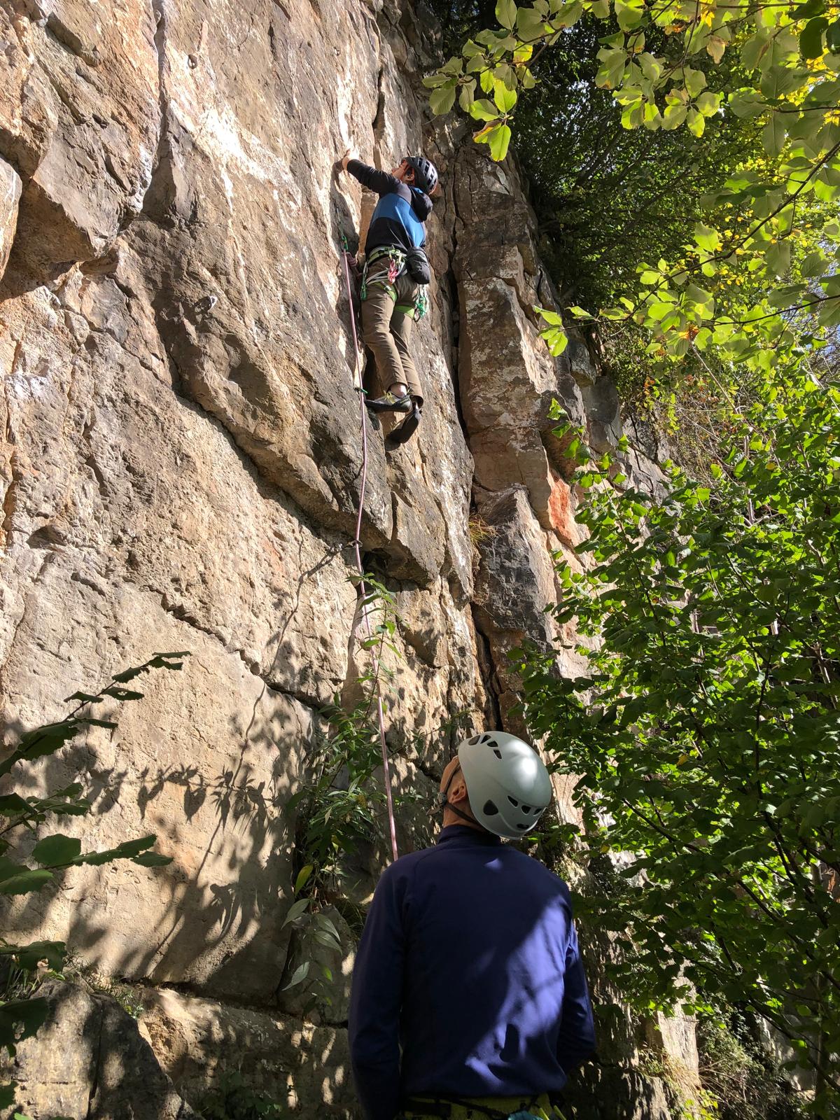 Sunday was unexpectedly sunny and warm, and the whole group went sport climbing at Wynd Cliff Quarry, joined by Brad who came for the day. Loz led and stripped his first ever sport climb. Gill led and stripped her second. Ange had never sport climbed before and said she wasn’t keen to climb outside but with a little gentle persuasion she was successfully getting up all the routes on top rope and had a great time with us. We climbed all day at Upper Lift Right, including Banarama, The Banana Splits, Nice Thicket, Simples and Hooting, to name a few of the climbs. Josh, Dom and Brad did harder stuff.