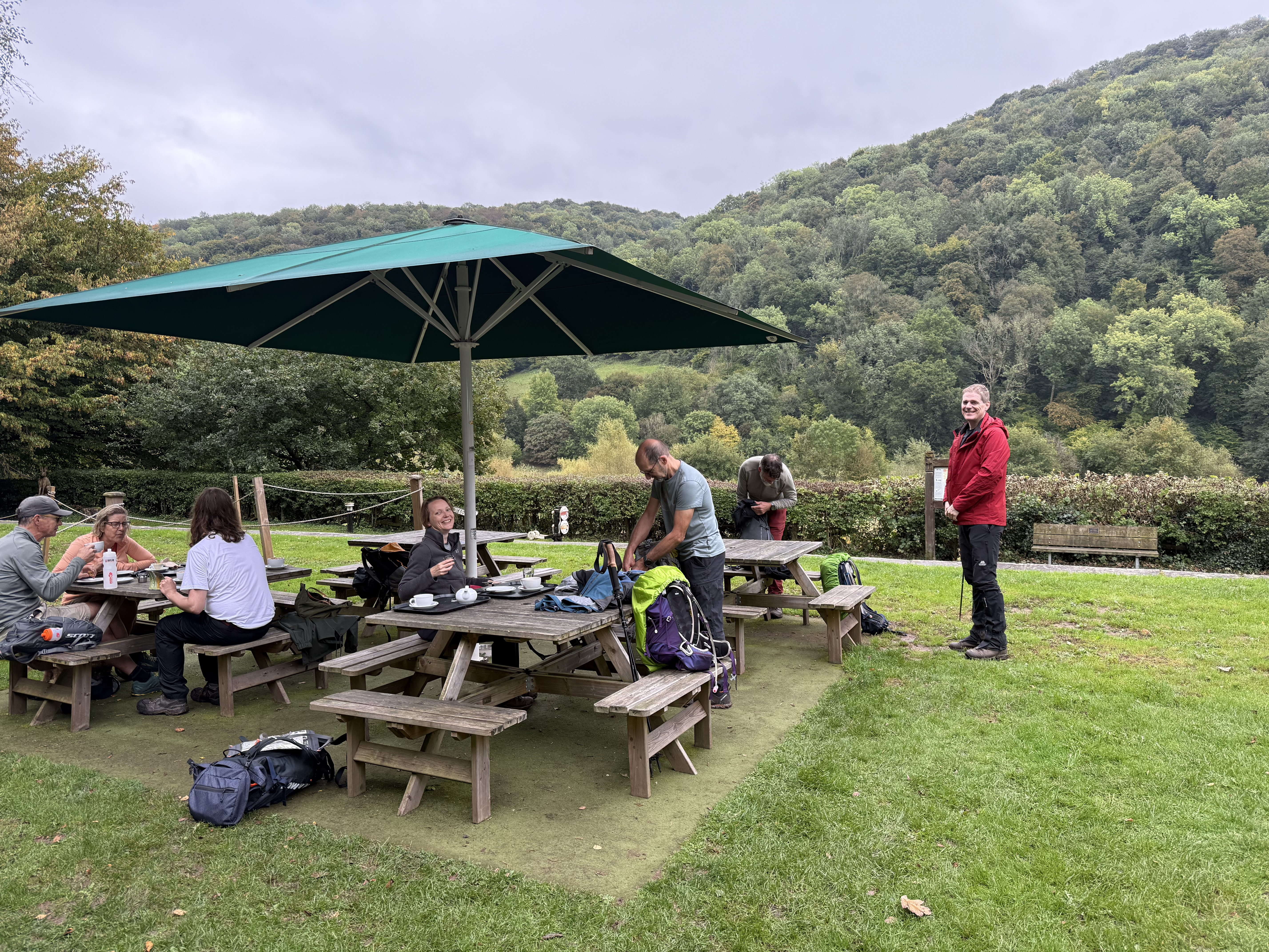The rest of the group decided to go for a walk. We did a circular from Beeches Farm, walking down through the woods to Tintern, across the river and turned right following interesting signs to Station Tea Rooms where we hoped we would find coffee and cake, essential carbs and caffeine. Station Tea Rooms was fabulous, built in an old railway station with a railway carriage visitors centre and inside / outside seating. We replenished our calories and the group split up, Sarah, Henry and Alan did a 13.8 mile loop and the rest of us (Gill, Loz, Naomi, Keith and Ange) headed back across the river and back up the hill to Beeches Farm. The group split again because some of us weren’t satisfied with only coffee and cake, we needed ice cream as well. So we continued on to Chase Farm via a local trip point and some cows. The ice cream group did 10.5 miles. We were lucky, most of the heavy rain held off until after we got back.