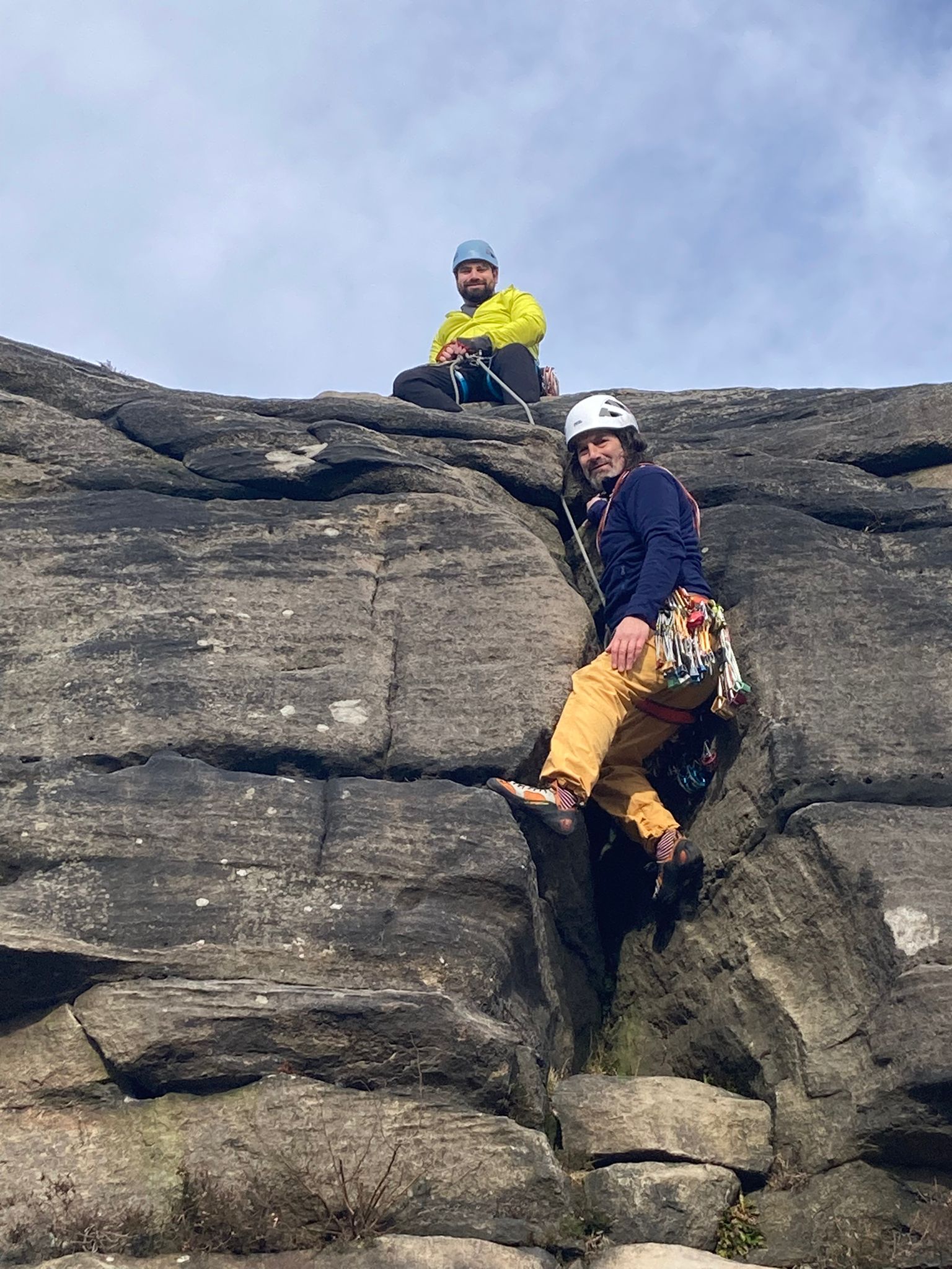Tom and Matt did a bit of shopping and then headed home early while myself, Charlie and Stuard headed to Rivelin seeking somewhere sheltered on what was forecast to be a cold windy day. The weather actually turned out to be very pleasant. We started up with a warm up on Temple Crack (HVD) before Charlie led (for the third time this year!) the spectacular Croton Oil (HVS 5a) on the Rivelin Needle. Stuart described this as the “best route he’s done” before getting a crash-course in abseiling as that’s the only way off of the pinnacle. I then led Left Edge, a VS 4c slab climb with a committing step out onto a hanging flange. Charlie then finished the day off with another strong lead of Blizzard Ridge HVS 5a which snakes its way around a prominent arete.