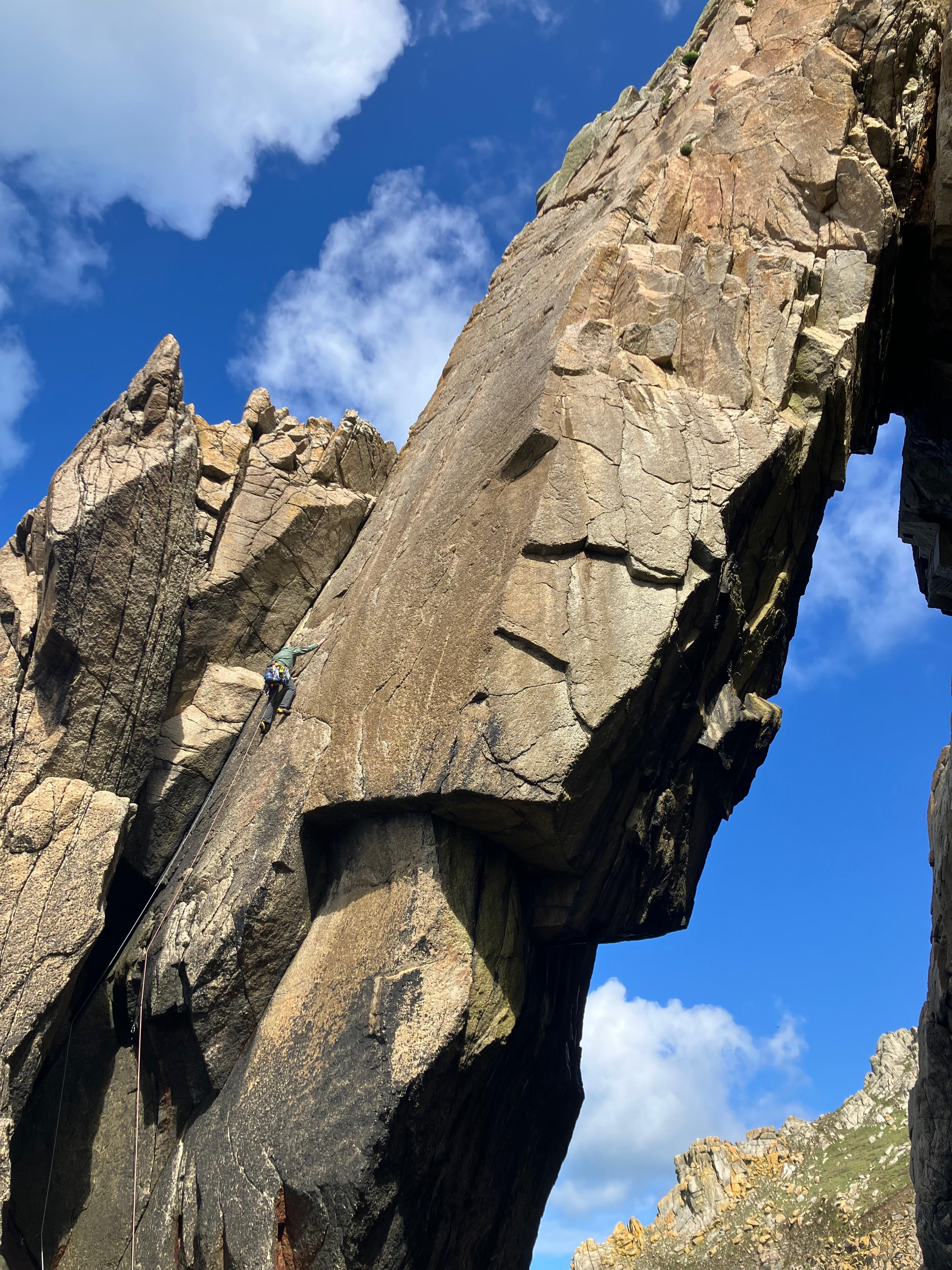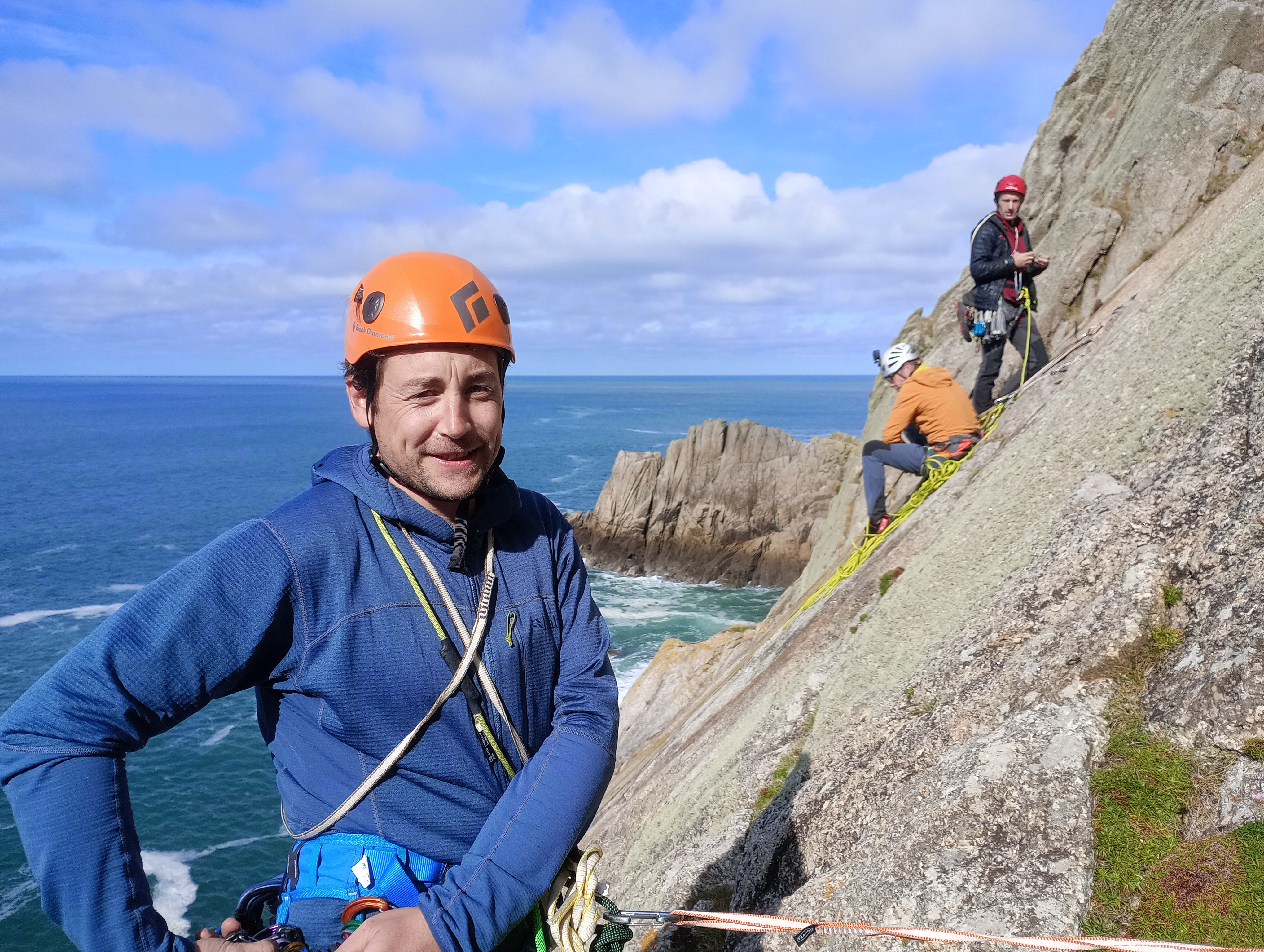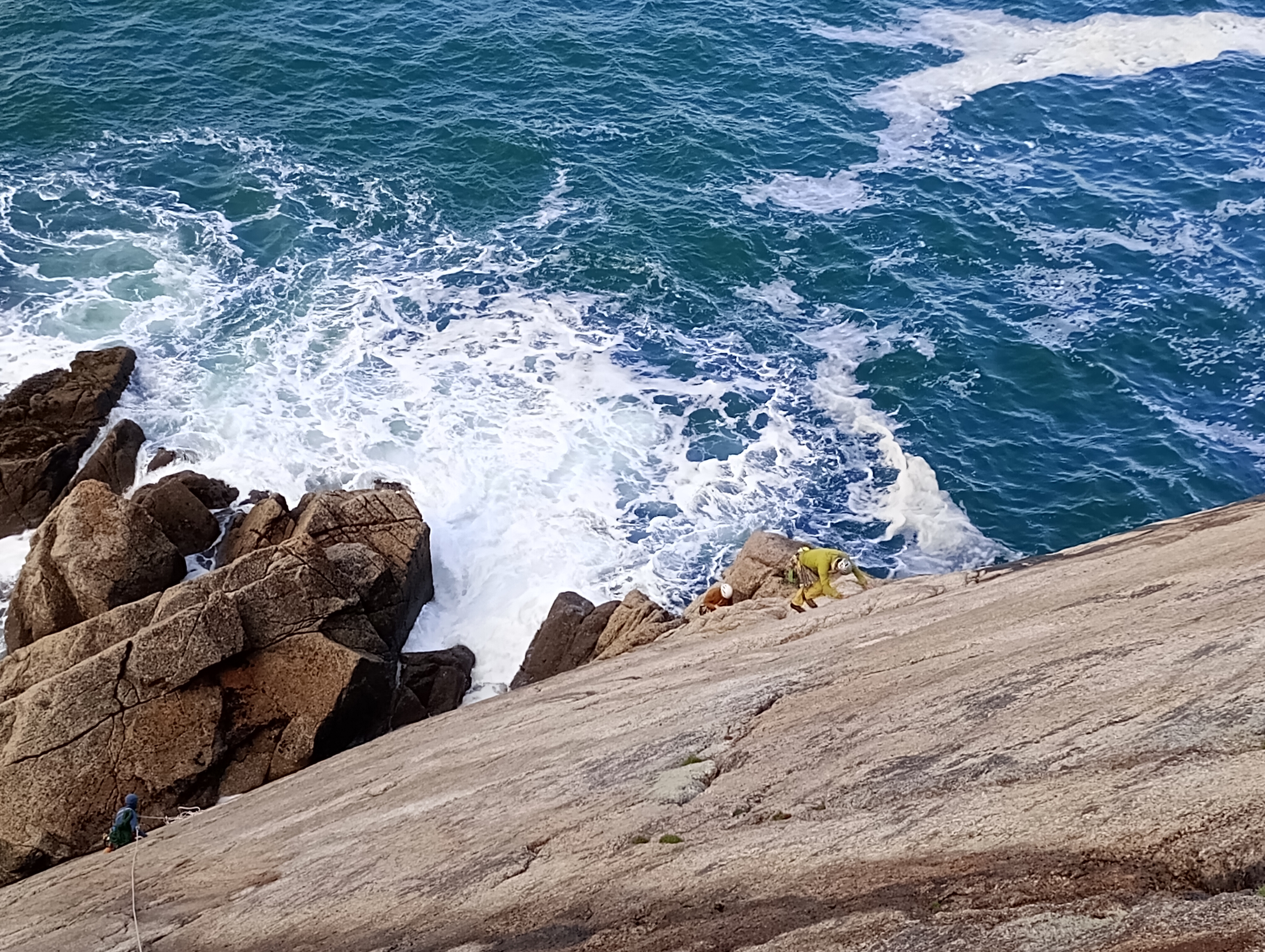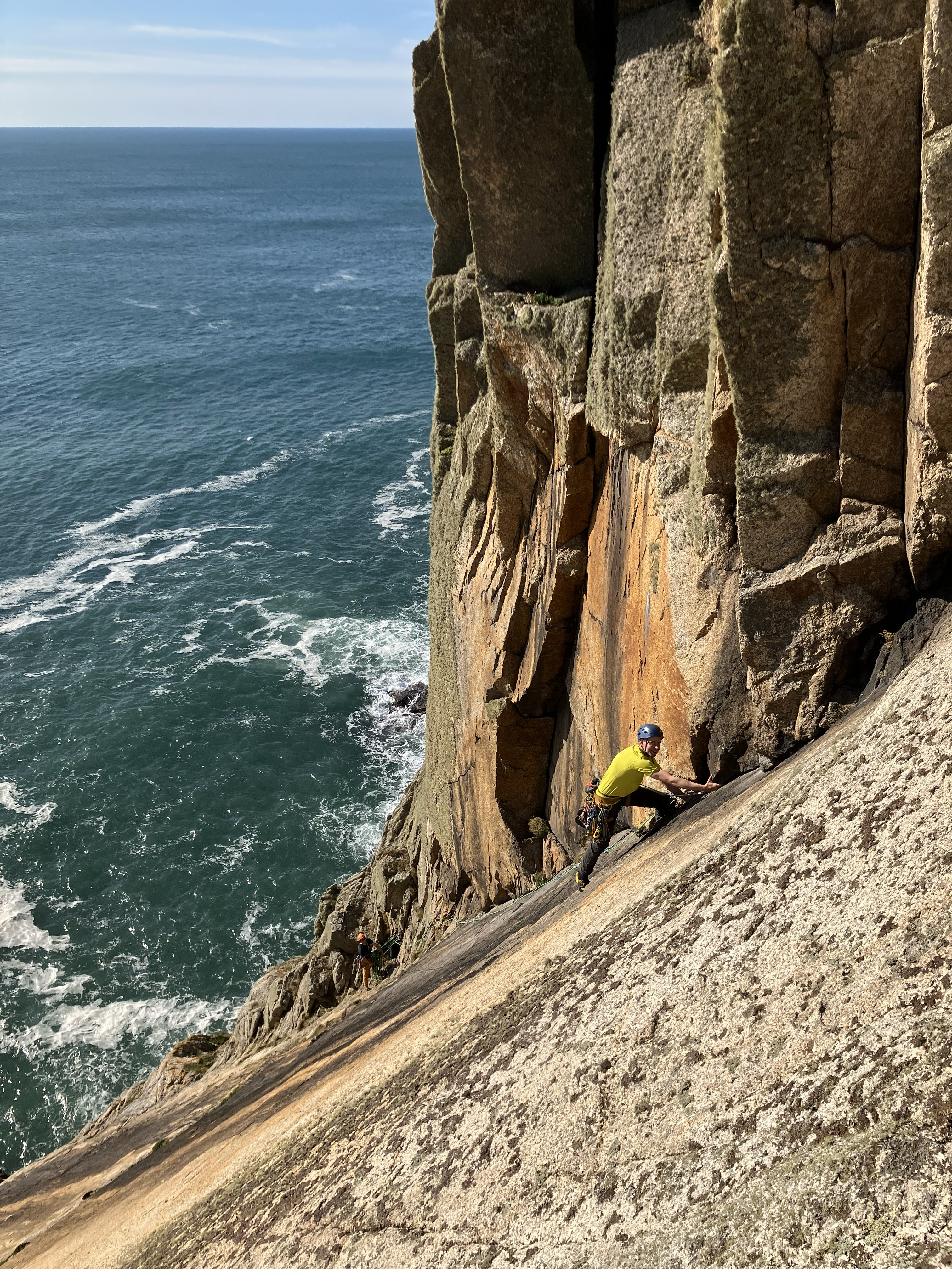 Albion starts similarly, before arriving at a main pitch which involves laybacking and bridging up the corner on juggy sidepulls and undercuts. Both climbs prove enjoyable classics, with more straightforward access and top outs than we’d found elsewhere on the island. We’re also joined on the slide by several other climbing teams, including James McHaffie, one of the UK’s foremost trad climbers, who’s on the island guiding clients.