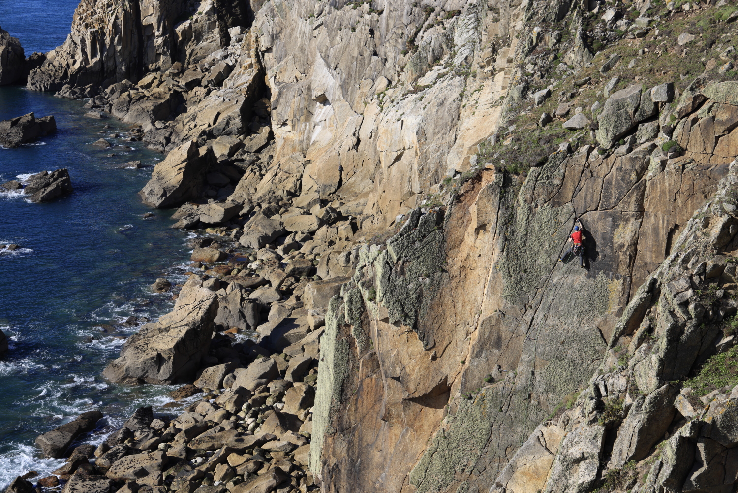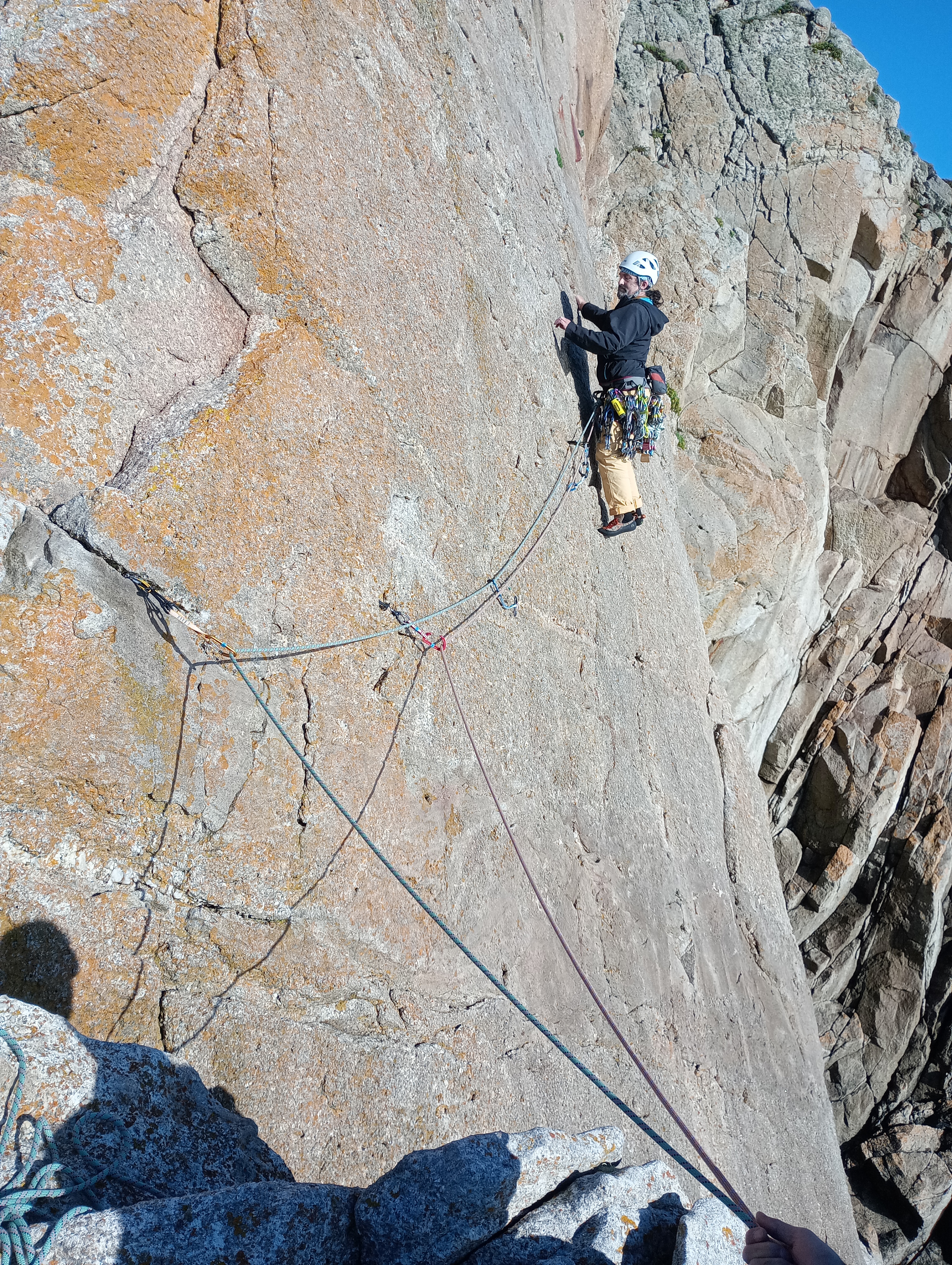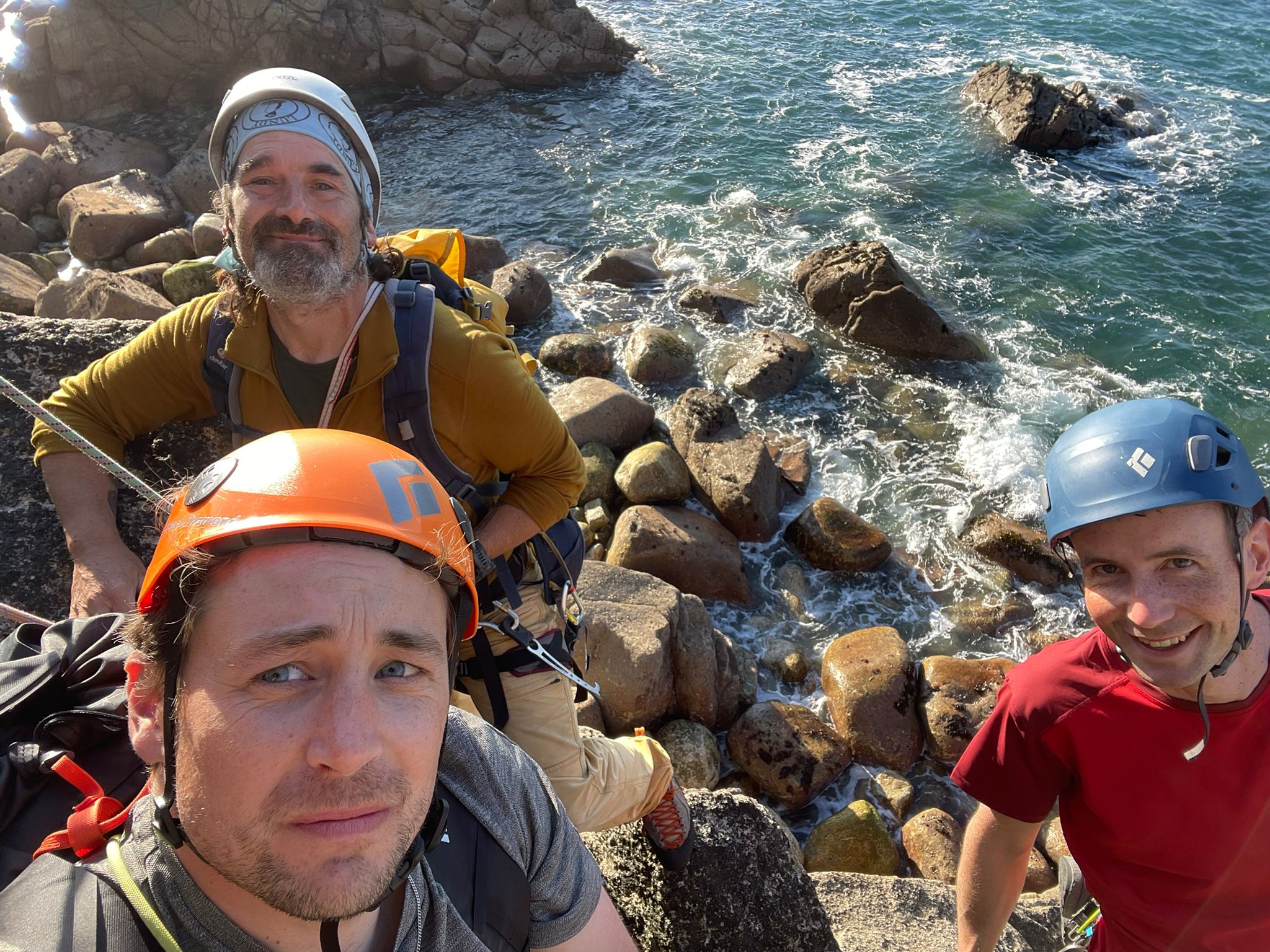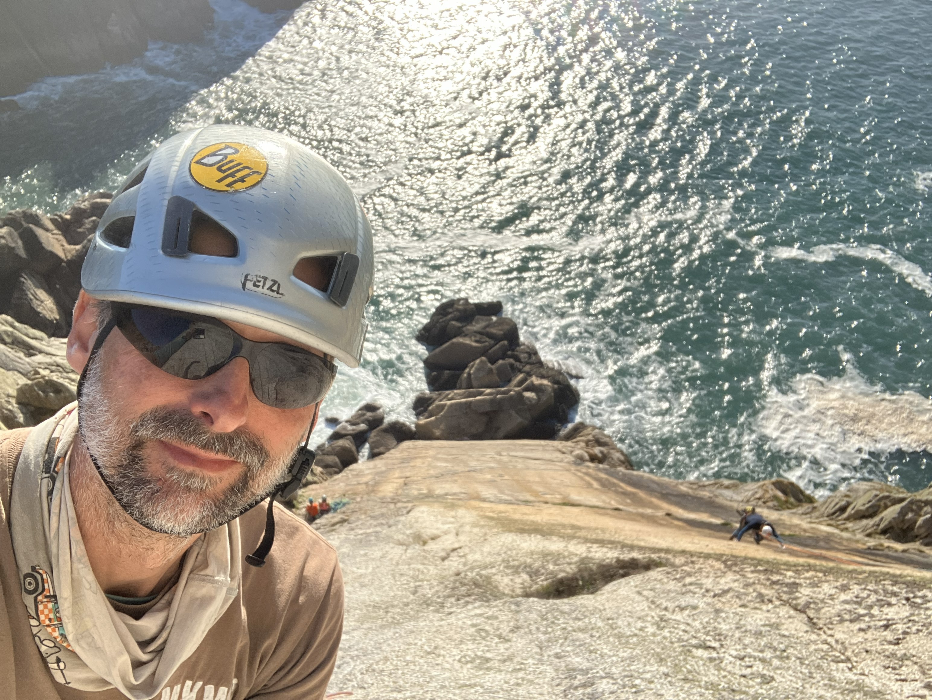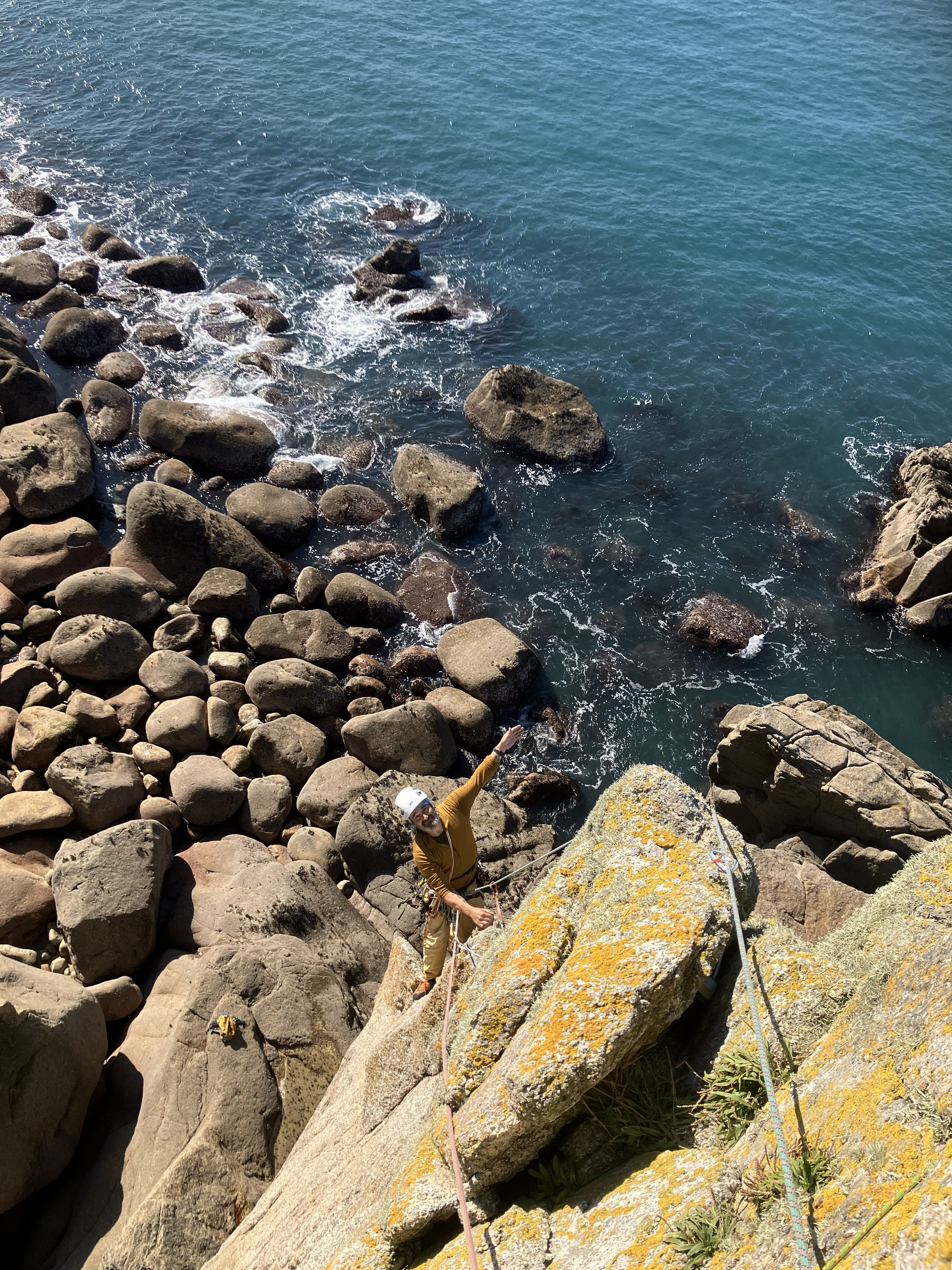 Albion starts similarly, before arriving at a main pitch which involves laybacking and bridging up the corner on juggy sidepulls and undercuts. Both climbs prove enjoyable classics, with more straightforward access and top outs than we’d found elsewhere on the island. We’re also joined on the slide by several other climbing teams, including James McHaffie, one of the UK’s foremost trad climbers, who’s on the island guiding clients.
