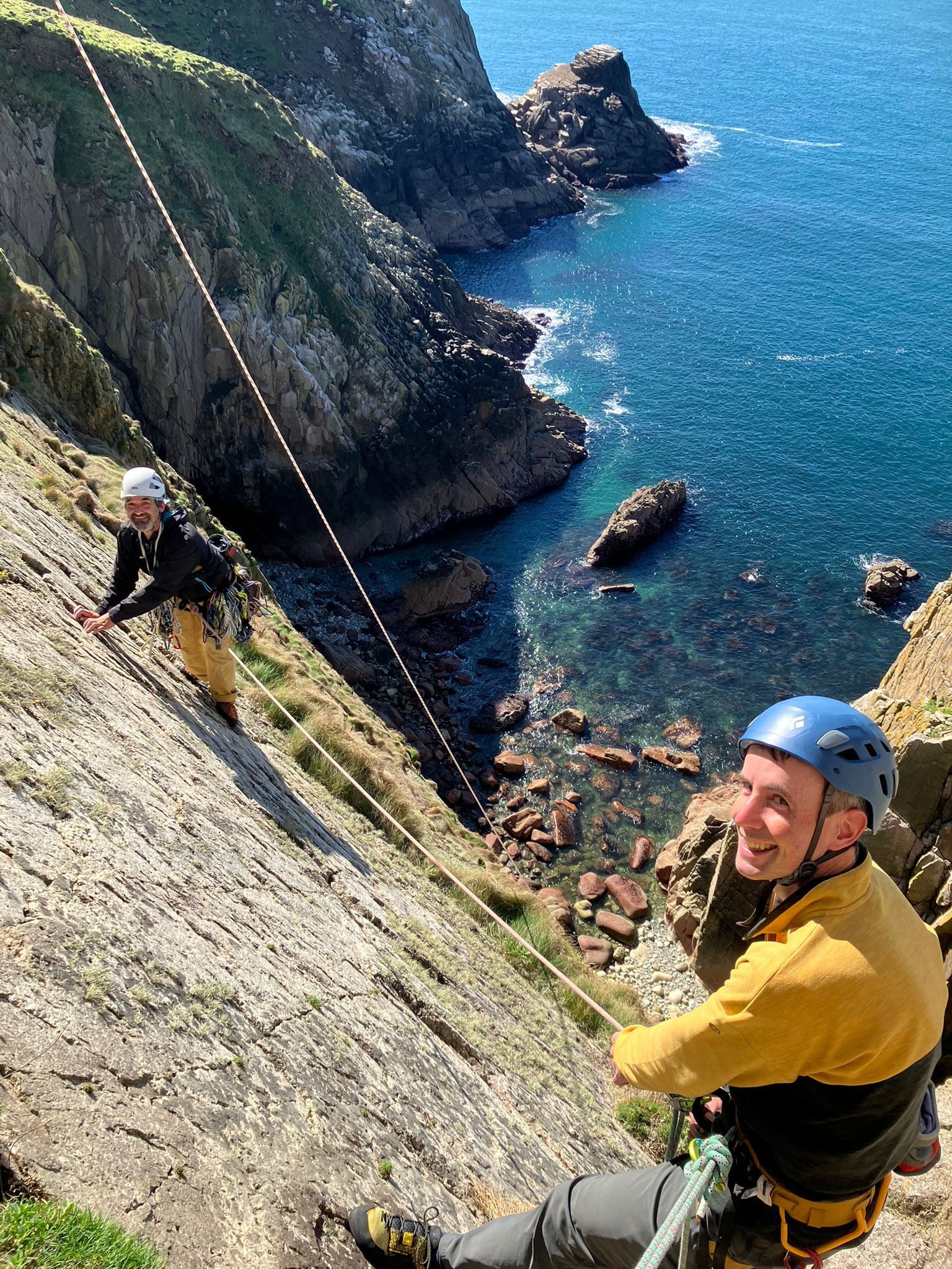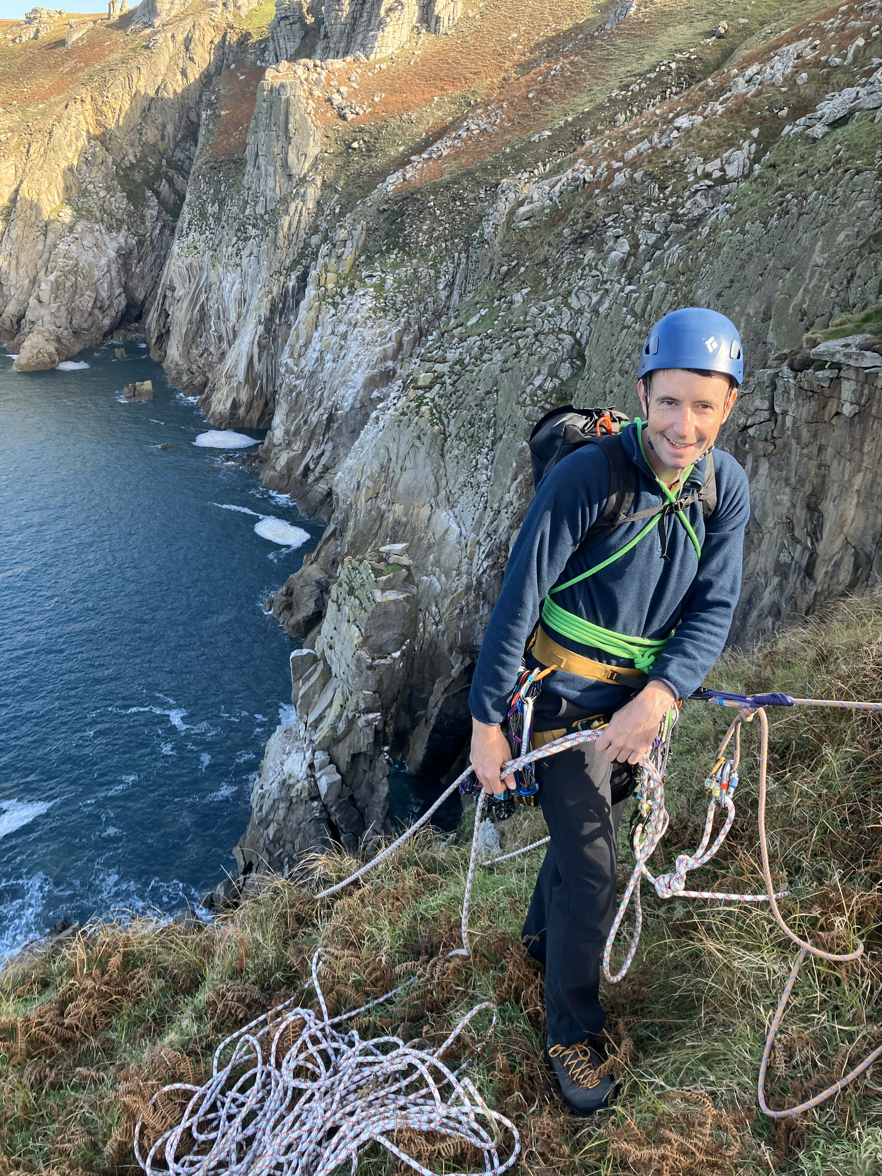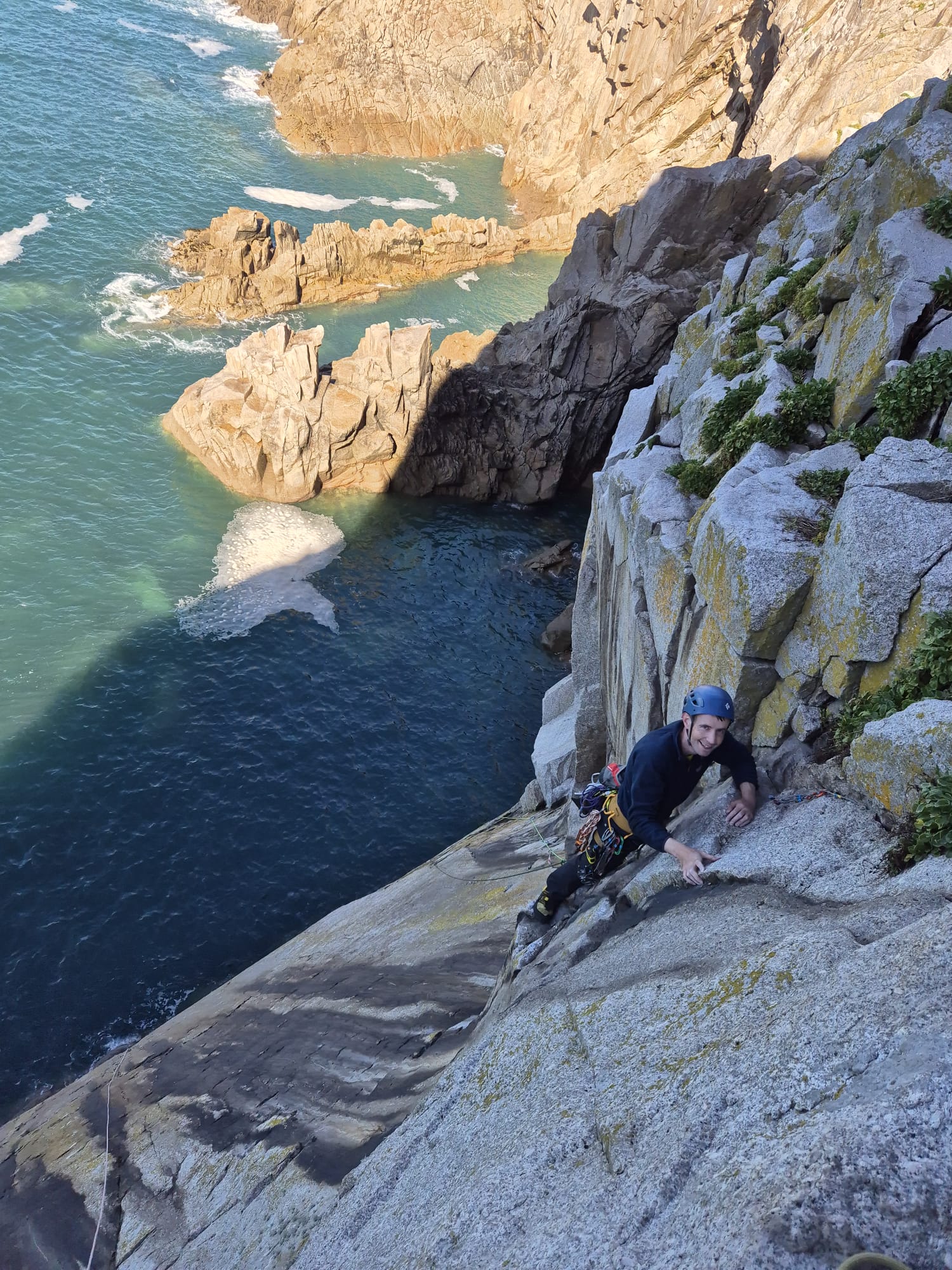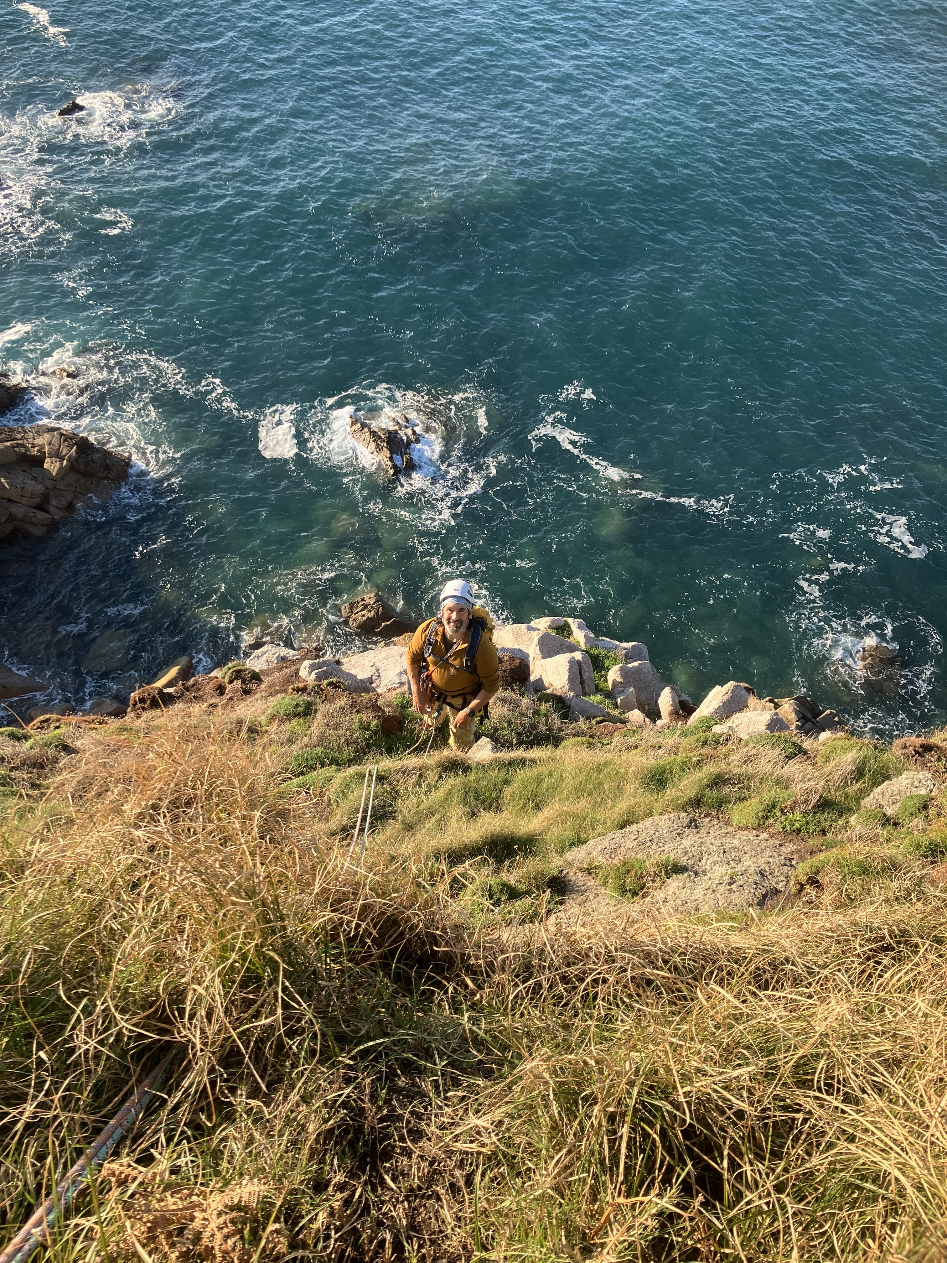 Having finished at the Needle and with the tide now coming in, each party scrambles back along the boulder field to reach the base of the Punchbowl cliff and our VS escape route, Pretender. We climb this in two teams, Peter and Neal going first, which means Peter takes one for the team in navigating the grassy top out back along to the abseil rope for a belay. The belay position, on long spongey grass with a view out over the entire cove as the sun is setting, is the best of the week.