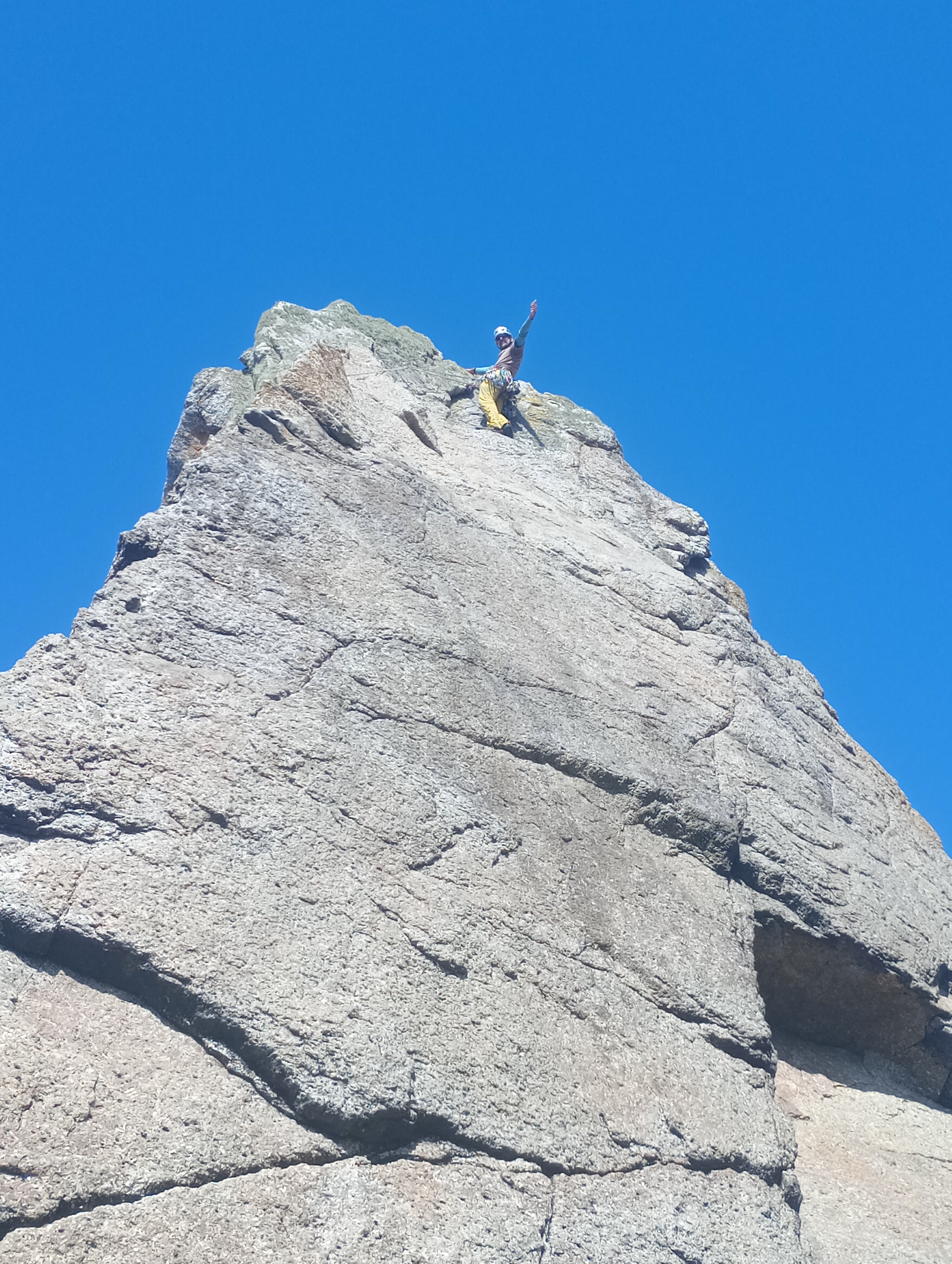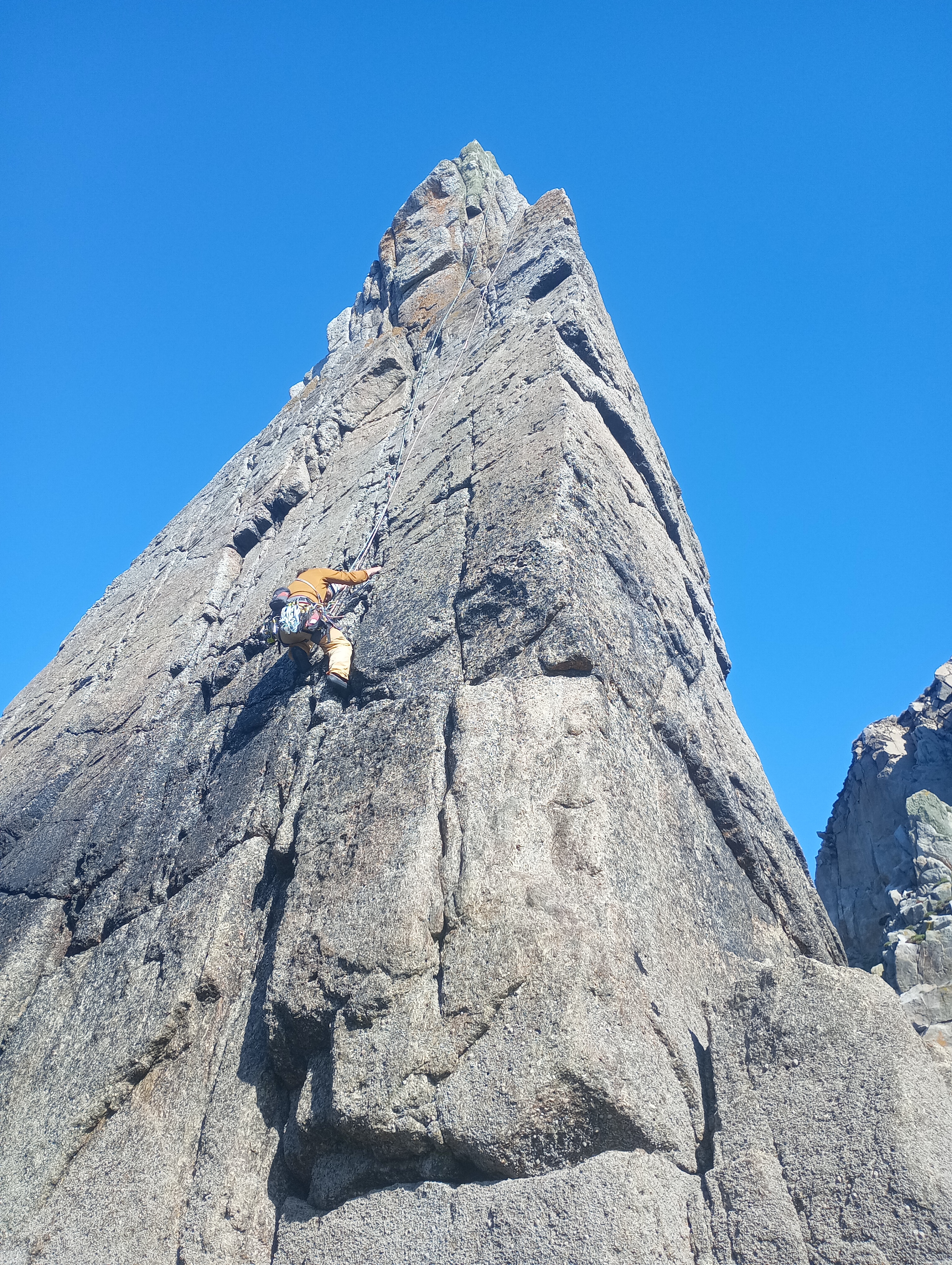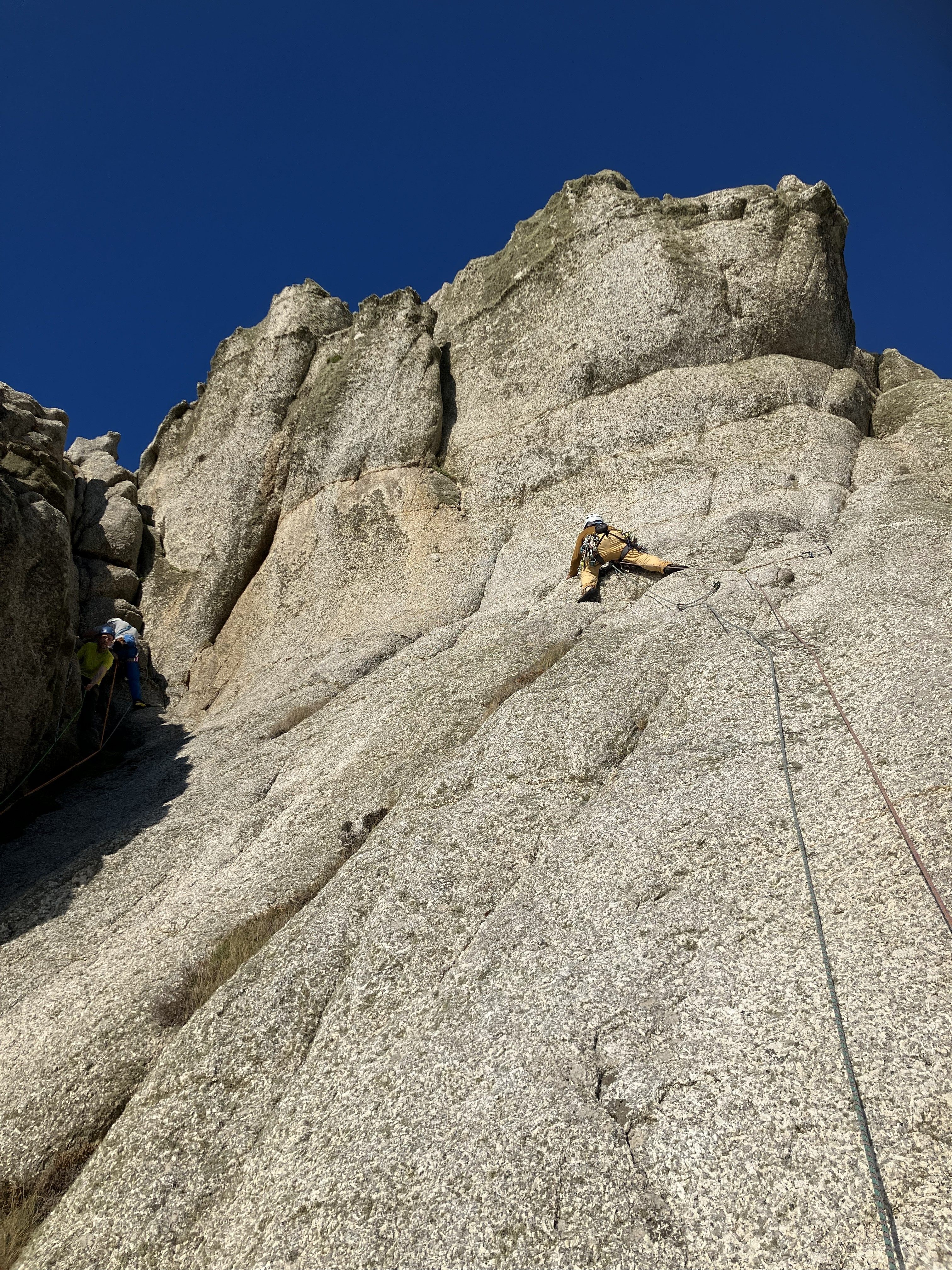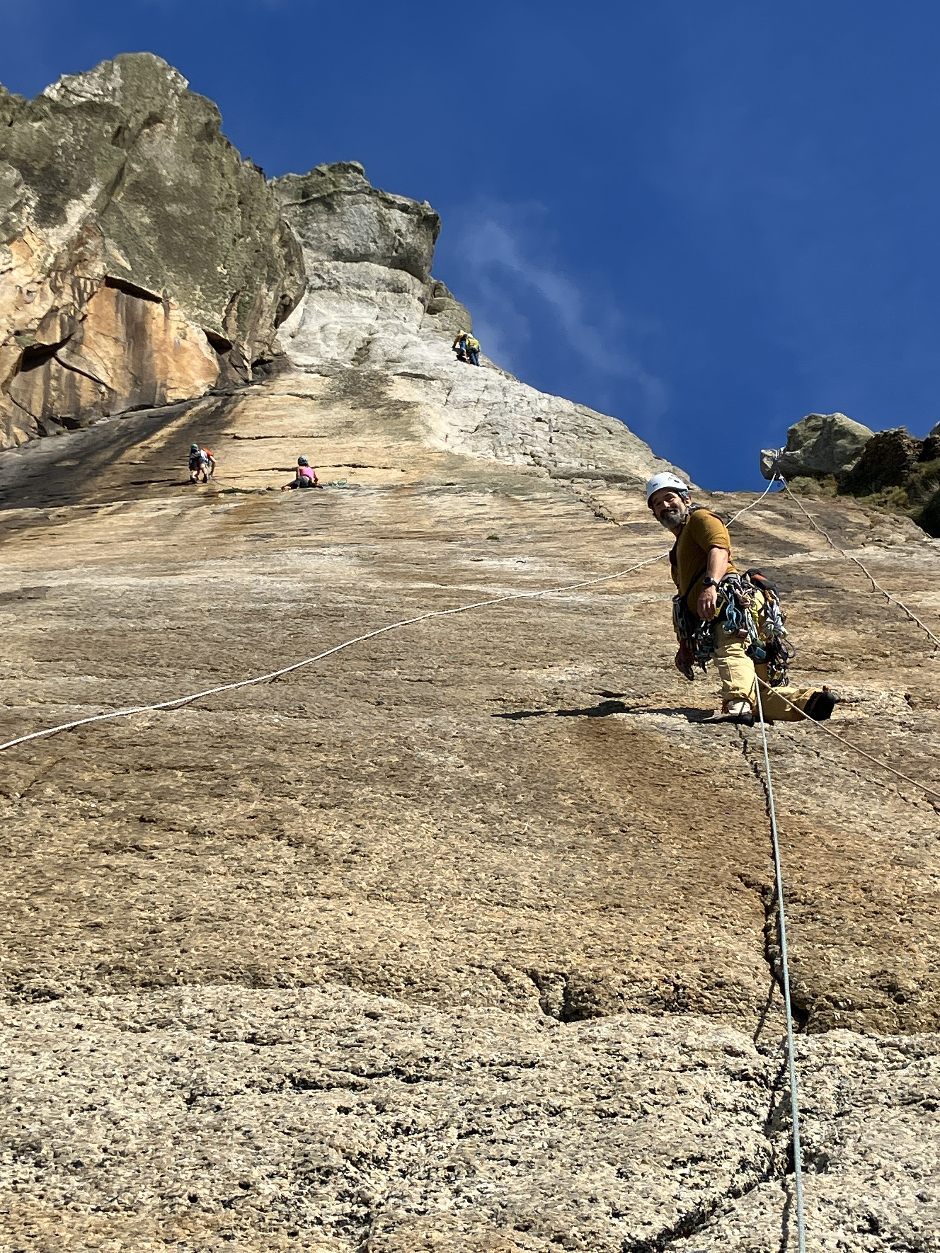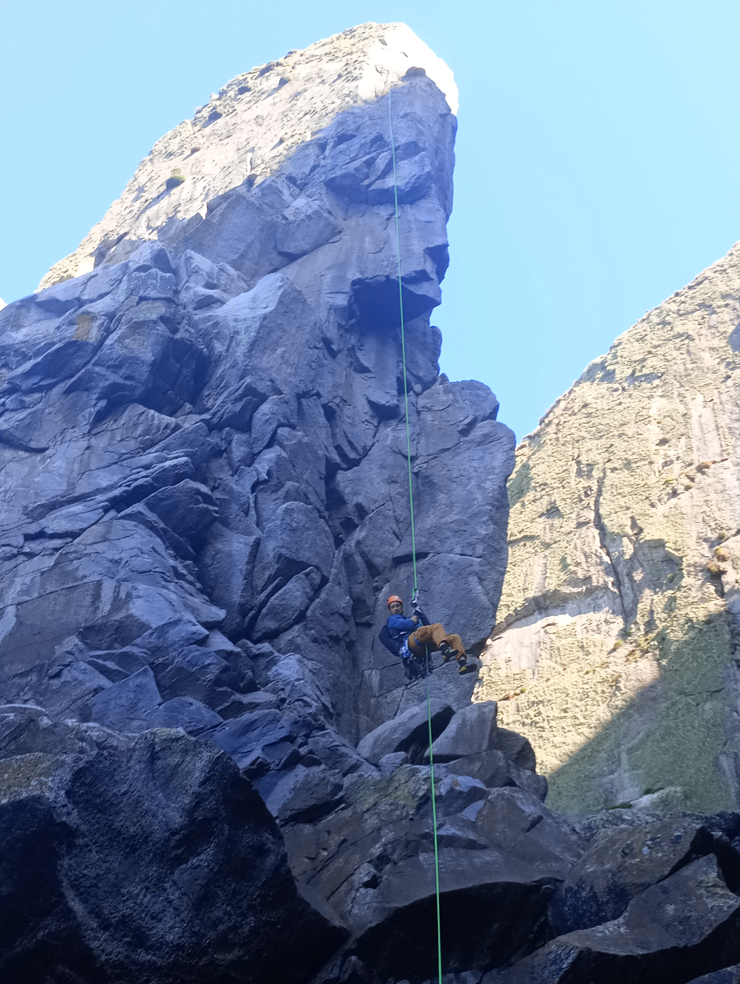 The routes on the Needle gave a great feeling of exposure as the Needle narrowed to a small flat point with the belayer hanging off the side. This provided more opportunity for learning about efficiency by setting up the abseil rope through the tat while belaying up the second.