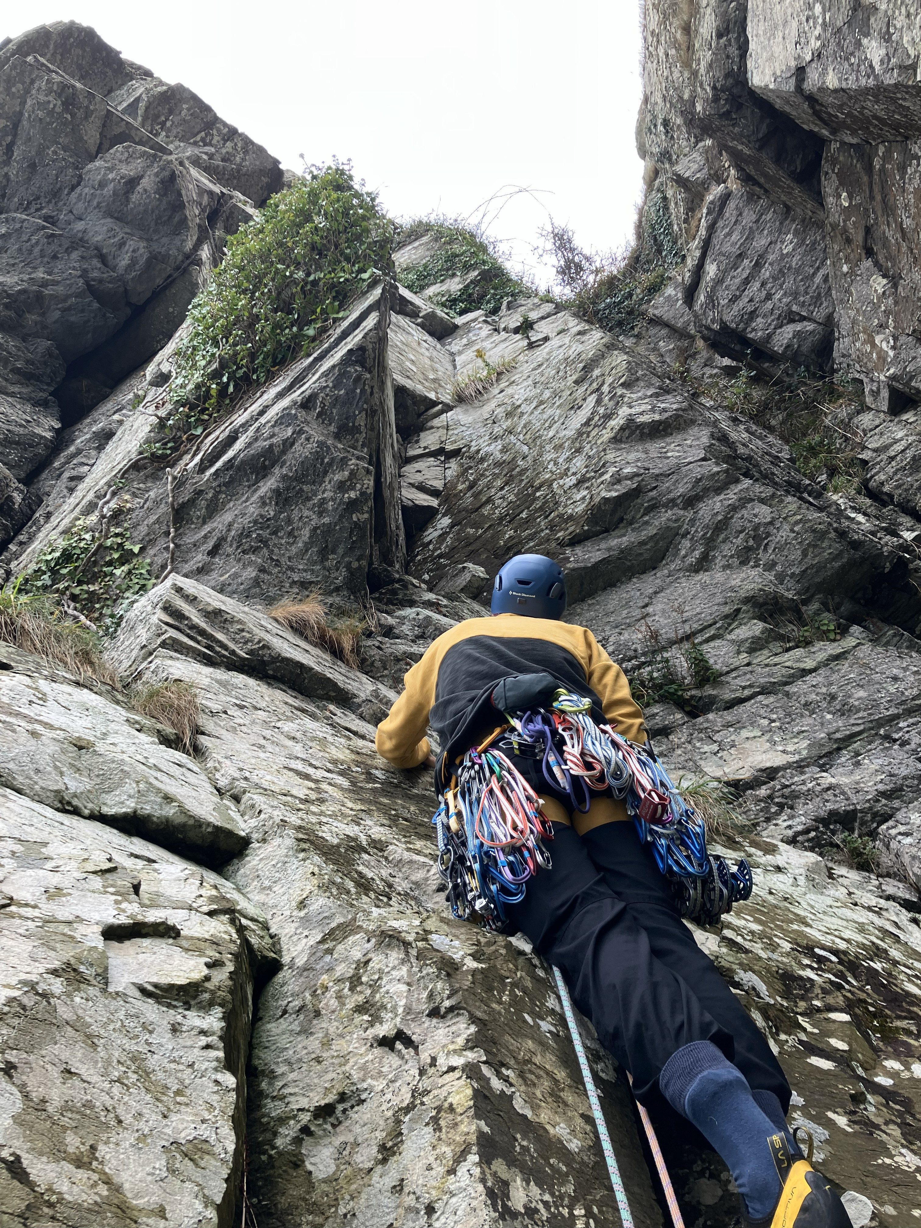 On the journey home, we reminisce about the trip. Well three of us do, Neal is so knackered, he falls asleep on the table. We reflect on how lucky we’ve been with the weather, and how fantastic and adventurous the climbing has been. But also, how we all feel we’ve honed our wider climbing skills on the trip, to deal with sketchy and involved approaches, committing climbing, harrowing top-outs, and other unforeseen surprises. Lundy is a fantastic and unique climbing venue, a perfect destination for an adventurous trad trip. But to get the best from it, comfort at climbing multi-pitch VS and abseiling, knowledge of rope ascension and self-rescue skills, and some broader problem-solving experience feel like prerequisites. Use of walkie talkies undoubtedly makes communication a lot easier too. Our thoughts turn to the next adventure. The weather means we’ve largely got what we wanted from Lundy, so while no doubt we’ll return one day, perhaps the sea cliffs of the Scottish Isles should be our next target.